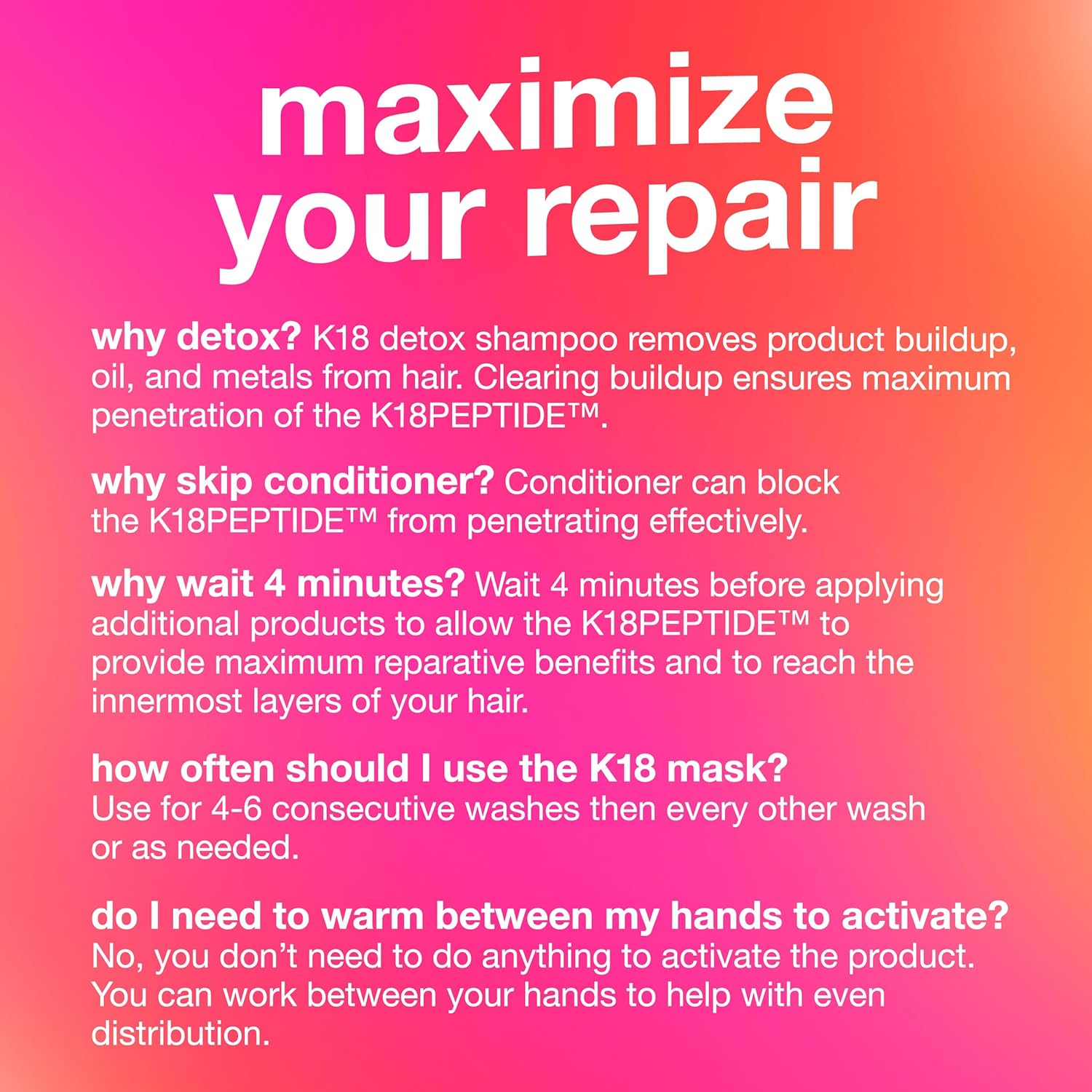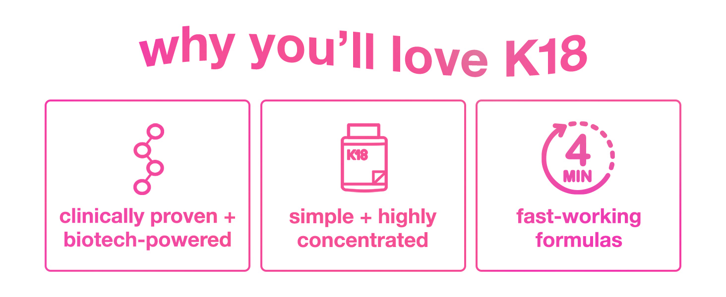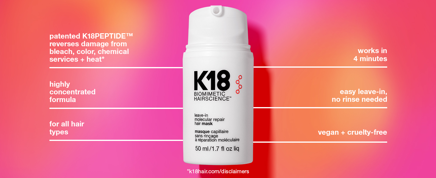 The K18 Mask works as a treatment to reverse damage in 4 minutes. It’s powered by our biomimetic K18PEPTIDE to seamlessly fit in and reconnect broken polypeptide chains at the molecular level.